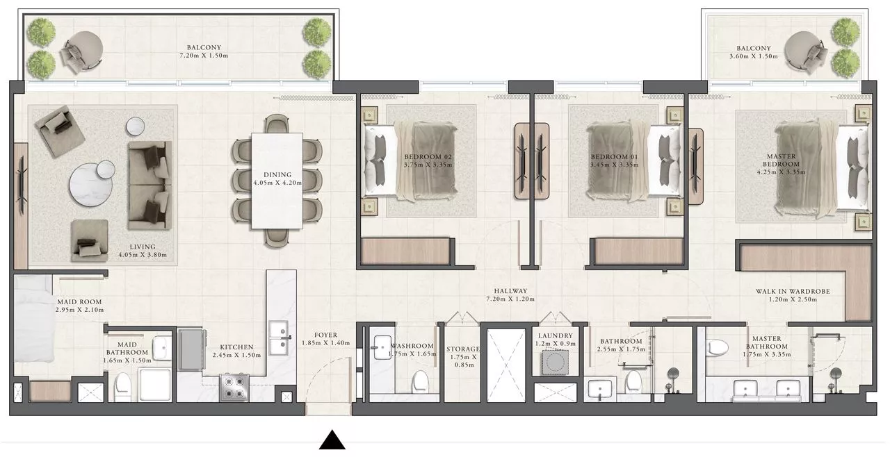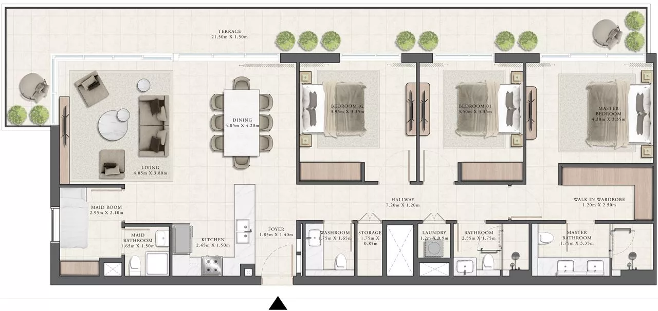 The living area of the properties ranges from 680 sq. ft to 2,011 sq. ft, and each residence will feature 1-2 balconies or a terrace, whilst 3-bedroom layouts will also come with a maid’s room. The design of the interiors will be executed in neutral tones, and complemented with porcelain tiles and laminate shutters with melamine carcasses.