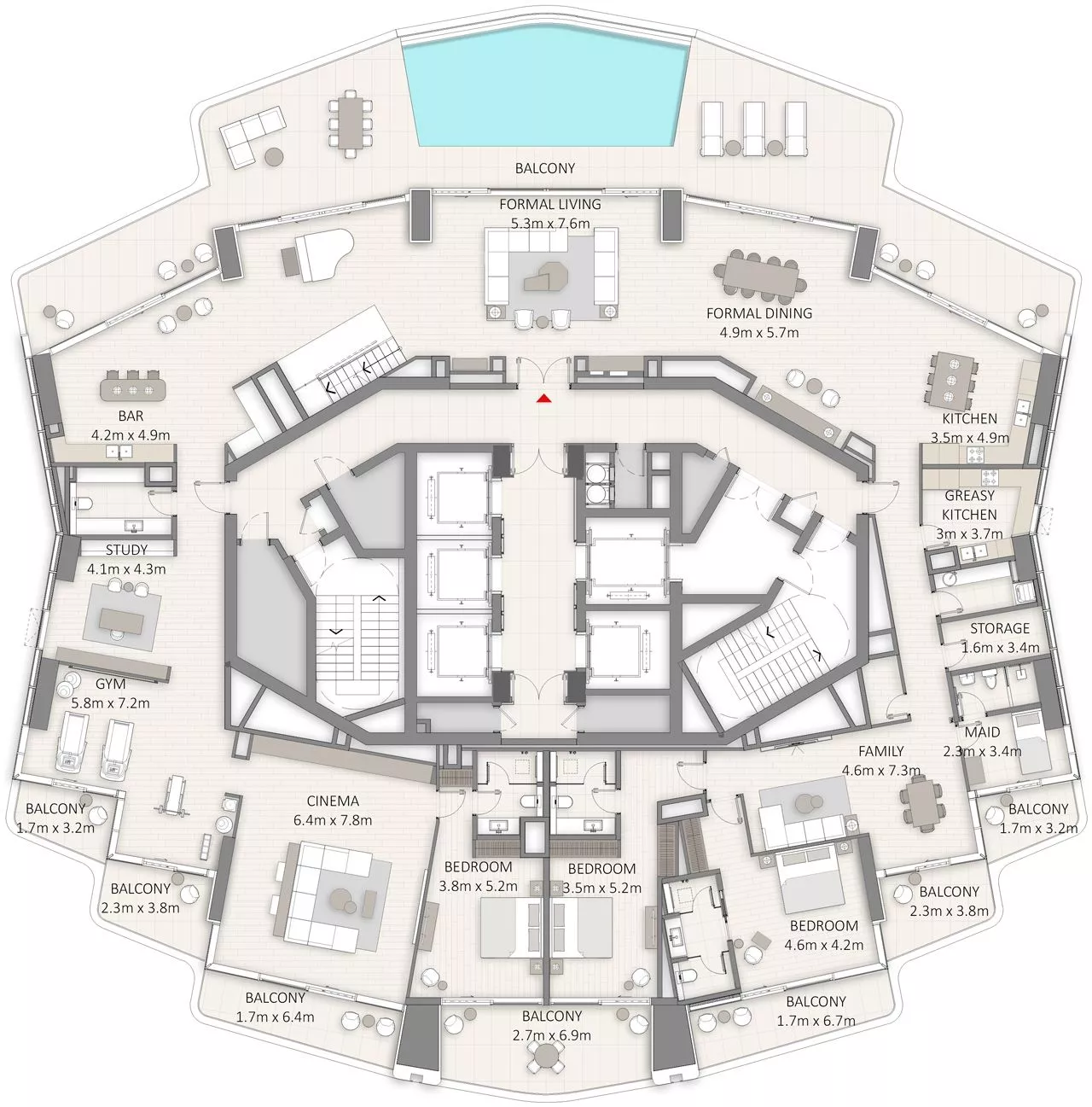 Those seeking for even more luxury and comfort may want to consider acquiring one of the 4-bedroom half-floor duplexes across levels 42–45, or an exclusive 5-bedroom Duplex Superlux Penthouse on the 2 upper floors (46-47), with living areas ranging from 7,270 sq. ft to 15,270 sq. ft.