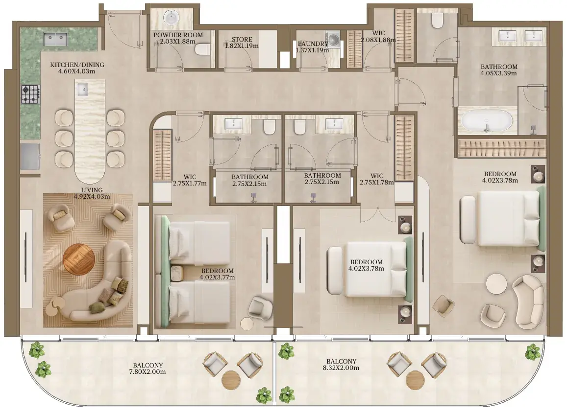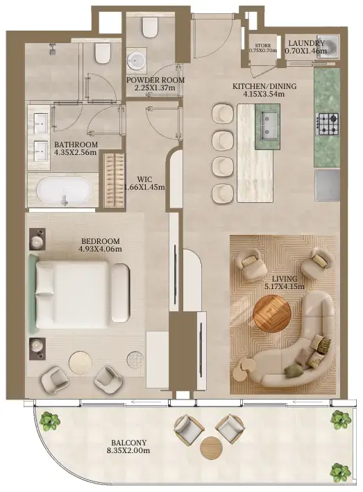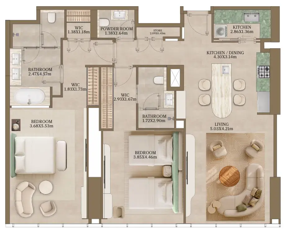 Inside, the residences and villas of Nasim Al Bahr reflect a refined balance of craftsmanship and nature. Interiors are adorned with natural stone, soft metallic accents, and warm timber tones inspired by the hues of dunes and sea. Every space—whether an apartment, villa, or penthouse—has been designed to embrace the light, breeze, and elegance of the setting. Fully equipped kitchens, open living areas, and premium finishes elevate everyday moments into serene experiences of comfort and sophistication.