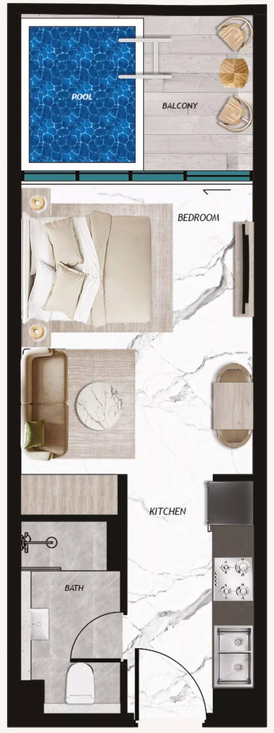 The properties measure from 400 sq. ft to 3,350 sq ft in size. Each residence is complemented with a balcony and a private swimming pool, making your stay even more enjoyable. There are smart home systems installed in all the properties, allowing you to easily adjust the lighting, temperature, security features and more. The 3-bedroom apartments additionally include a laundry room and a maid’s room. It is your choice whether you would like your residence to come furnished or unfurnished.