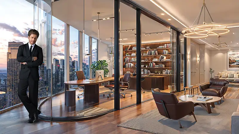 Rising higher in the vibrant metropolitan skyline, this tower 55 storeys is crowned by a helipad at level 56. The ground level is curated with a grand welcome into the double-height grand lobby with a huge glass facade that keeps the room illuminated during the day, while the bespoke lighting, soft finishes, and elegant finishes create an aesthetic and rich ambience. The King’s Signature Pose monument is the selfie point, a valet parking, an e-scooter parking, a drone docking station, and many facilities are provided on the ground. However, various multiple levels are also curated with world-class amenities such as level 9 with a Zen garden, cricket pitch, a padel court, an urban park, a jogging track, and a podcast studio. Moreover, the 33 to 35 levels planned with a sky pool, a gym, lounge 33, a clubhouse, a multipurpose hall, and a meeting room ideal for relaxation, well-being, and formal & casual meetups.