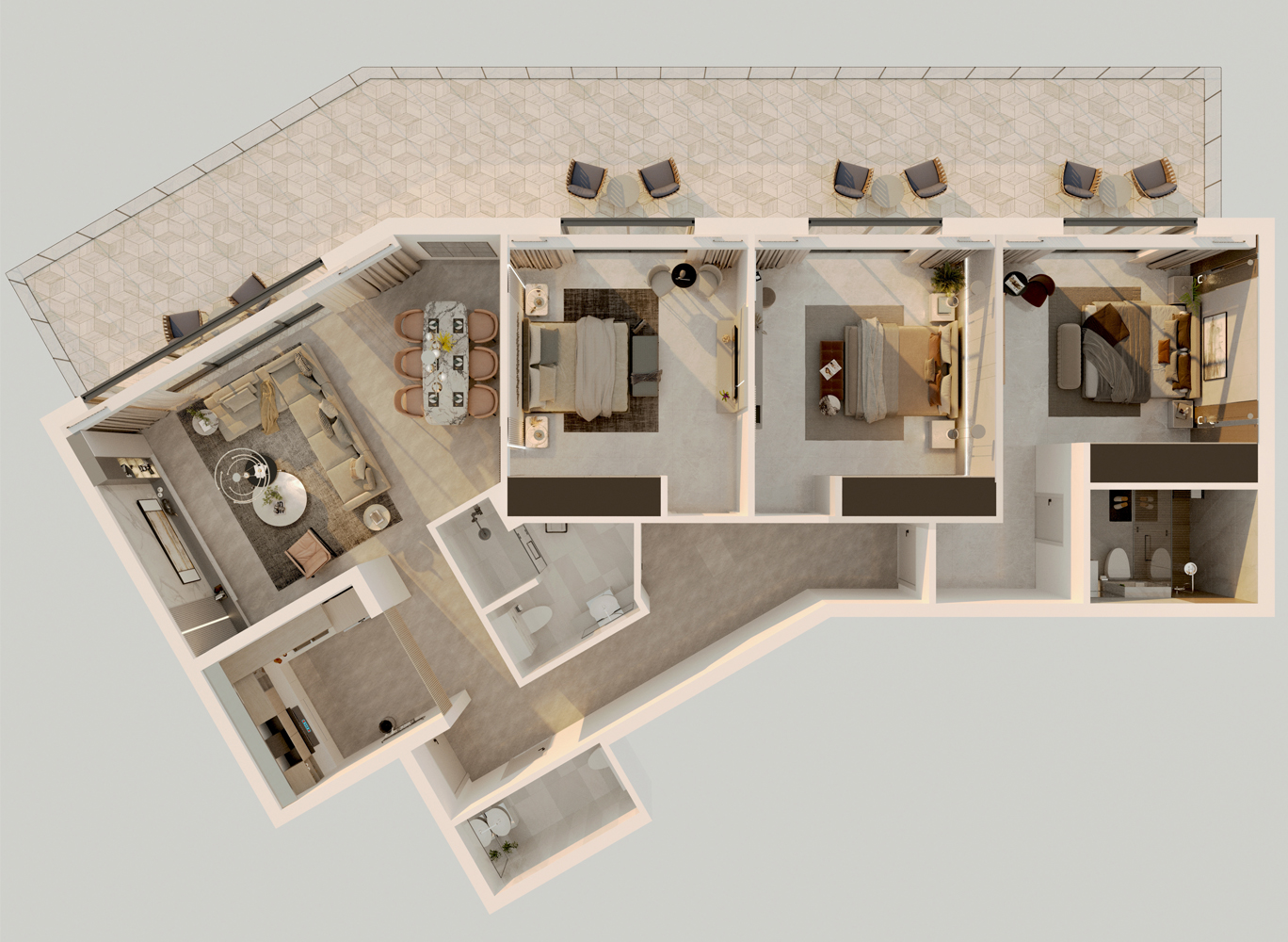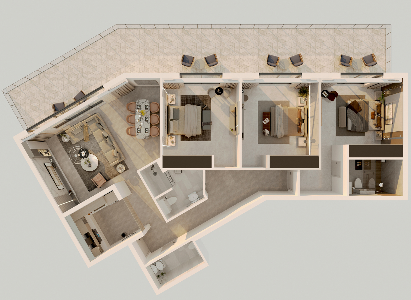 The exclusive designed façade promises a lifestyle beyond compare, exemplifying the epitome of elegance and modern living. The meticulously designed apartments boast contemporary finishes and expansive floor to ceiling windows that usher in abundant natural light, creating a bright and inviting ambiance. Residents have the unique privilege of enjoying private jacuzzi pools, adding an extra touch of opulence to their living spaces.