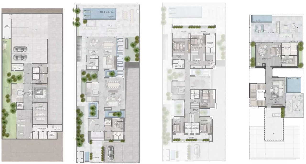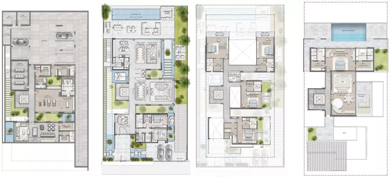 In terms of villa sizes, they range from 13,555 sq. ft to 25,317 sq. ft. All of the properties have 4 floors, providing plenty of space for comfortable living and guest entertainment.