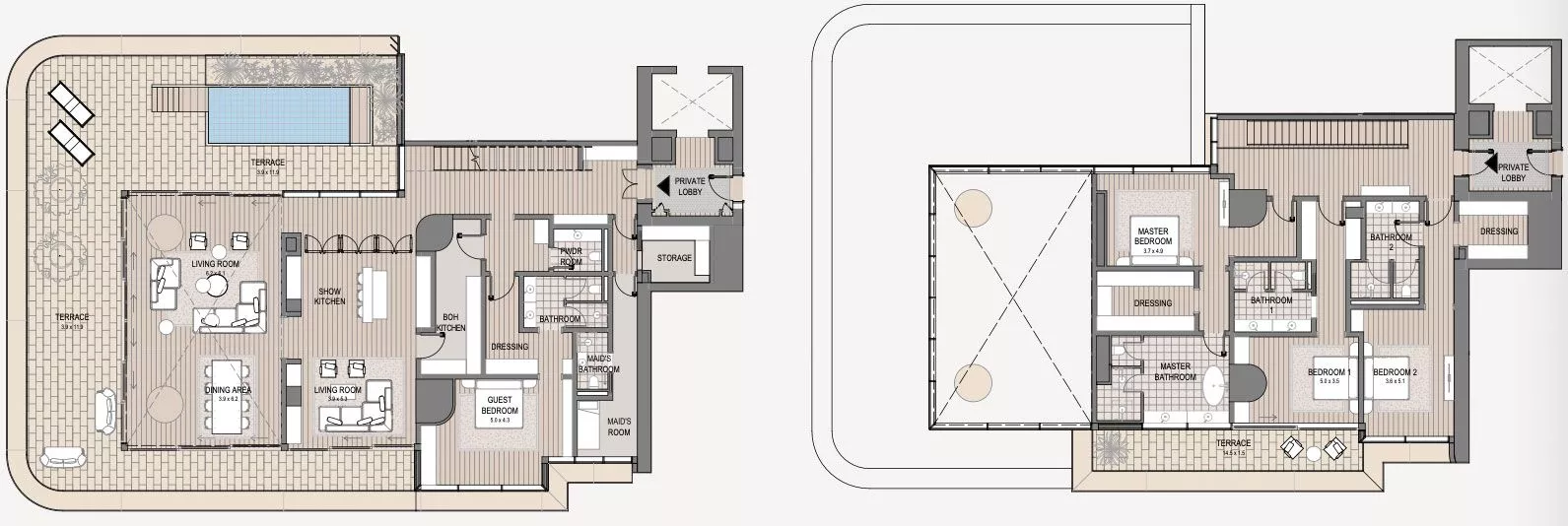 The layouts of the stunning residences feature spacious terraces which will allow you to enjoy fantastic views of Marasi Bay, Downtown Dubai and the Burj Khalifa. Select units come with private swimming pools, which will create a resort-like atmosphere right in your home. To create an exceptional arrival experience, the lift will open directly into the apartment.