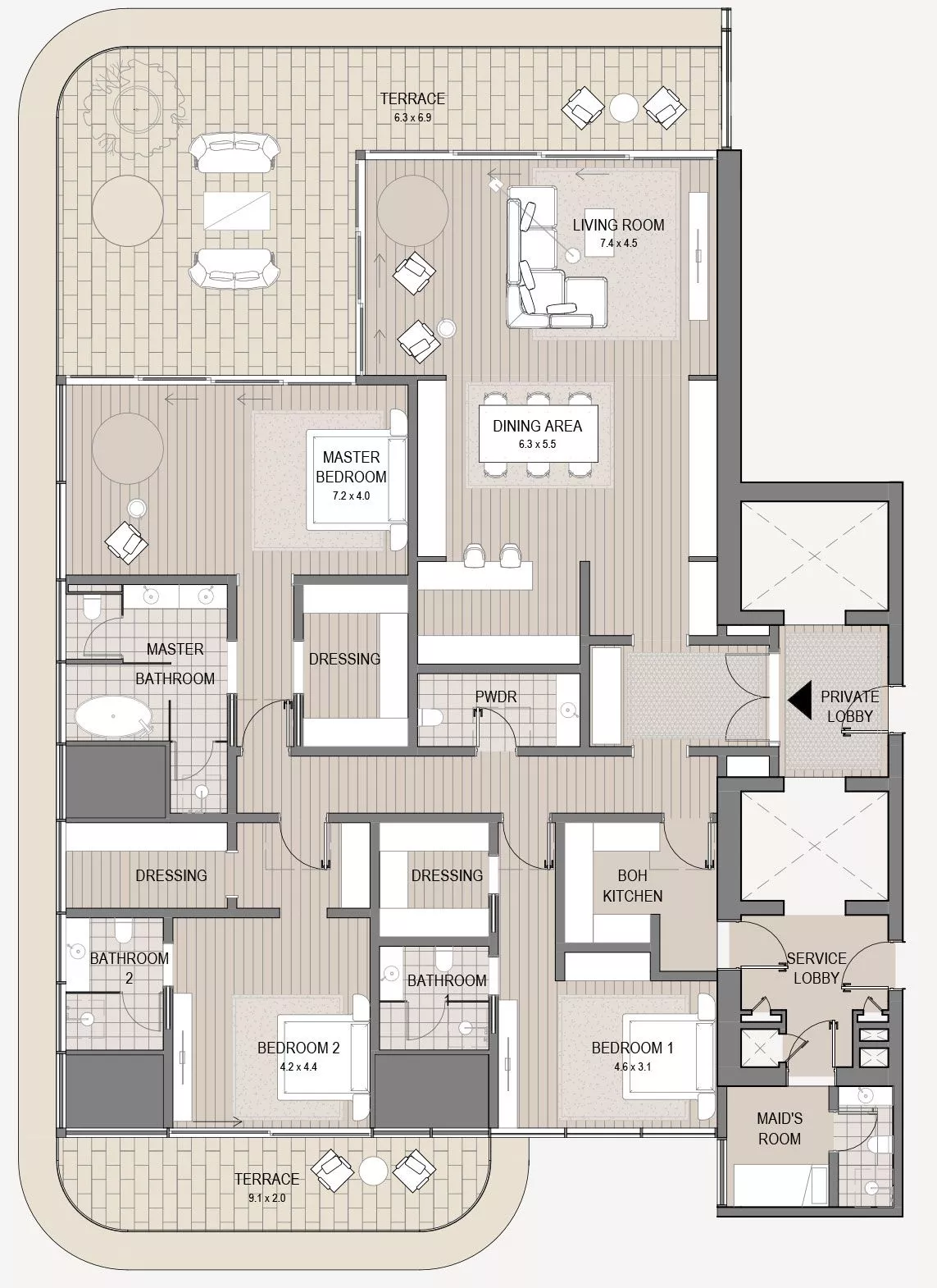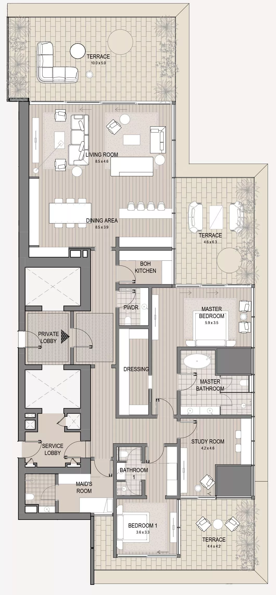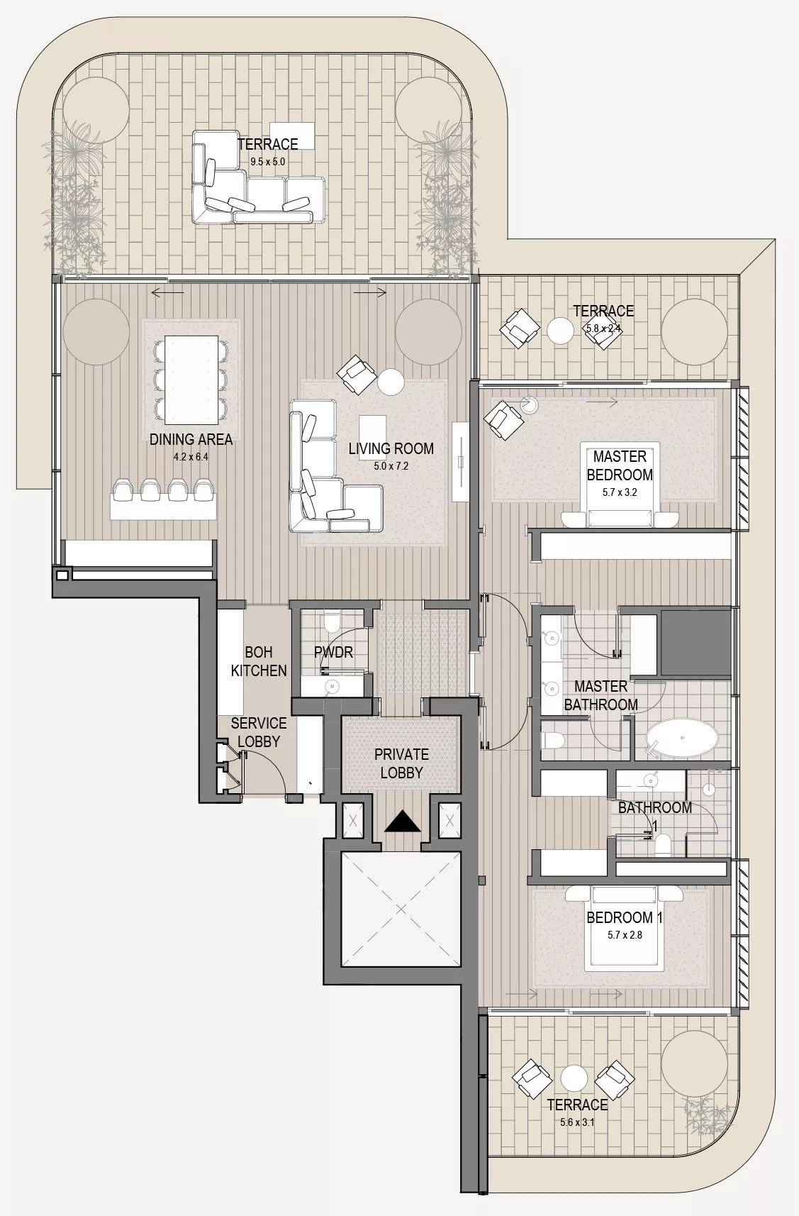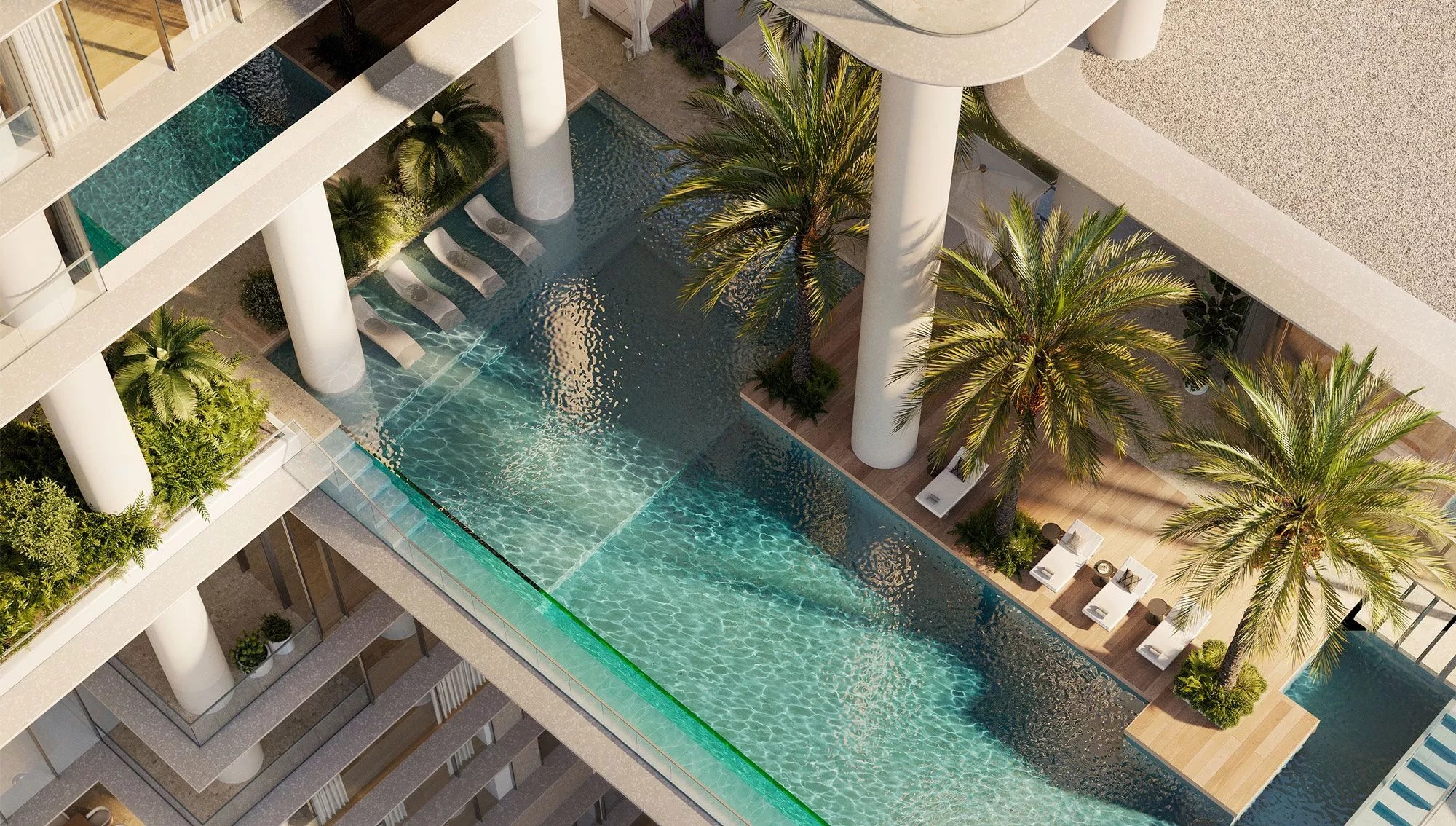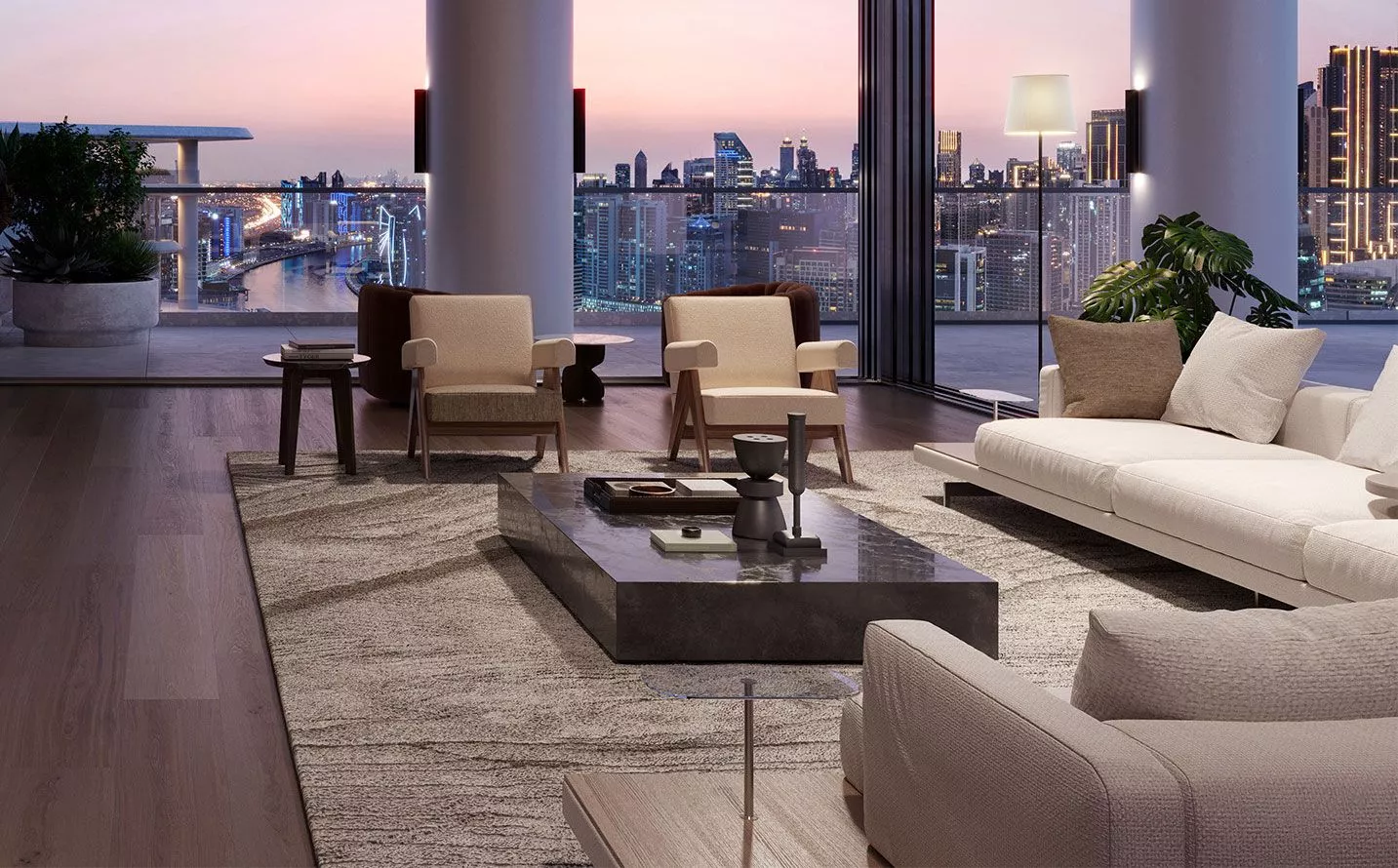 On the podium will be meeting rooms, a private spa, an indoor lap pool, a children’s pool, direct promenade access and golf car service to 2 other developments by OMNIYAT – the VELA complex and the LANA hotel.